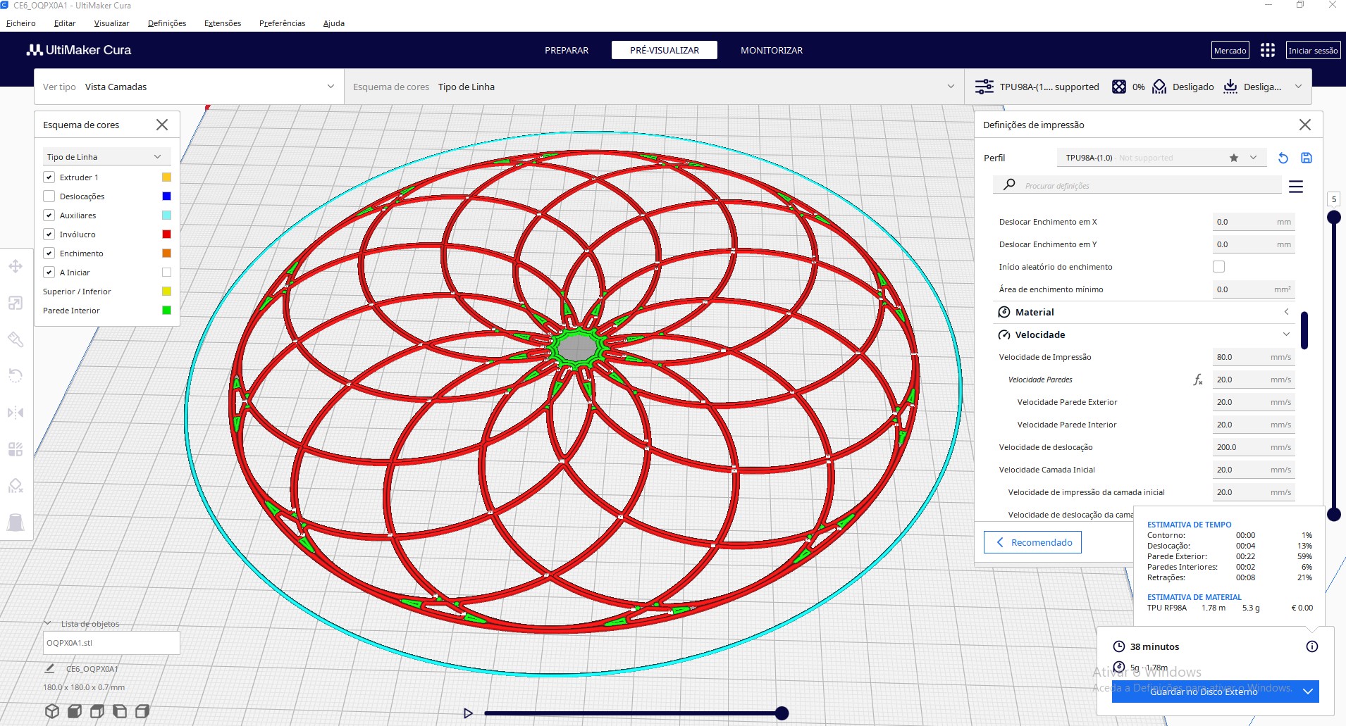 The resulting digital model was exported as an STL file and prepared for fabrication using Ultimaker Cura. The material selected was TPU 98A, chosen for its elasticity and strong adhesion to textile substrates.