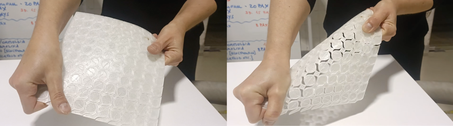 As the TPU is deposited, the structure becomes mechanically linked to the stretched fabric. Once printing is complete and the fabric tension is released, the elastic recovery of the textile induces controlled deformation and self-forming behavior in the printed geometry. This results in a flexible shell-like structure that emerges through material interaction rather than through a rigid mold.