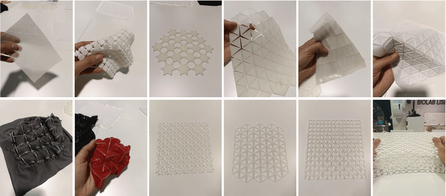 Based on the classification of computational couture structures, the practical exploration focused on two specific approaches: 3D printing on fabric under tension and geometry-driven auxetic structures printed in TPU. These case studies were selected to investigate how geometric parameters, material stiffness and fabrication conditions influence emergent textile behavior.