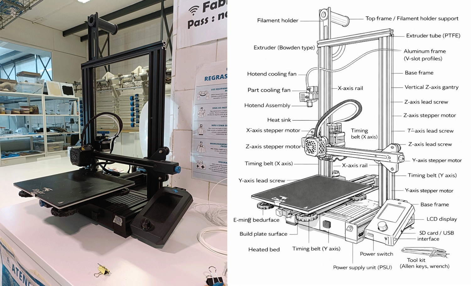 Ender 3D Printer at Biolab Lisbon and Ender 3D Printer AI illustration by Carlotta Premazzi. (eden.art illustration from a real photography)