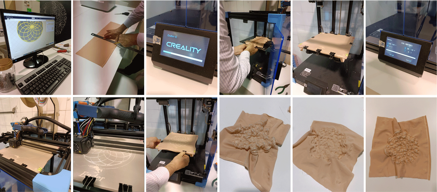 To ensure accurate deposition on fabric, printing parameters were carefully adjusted. The nozzle temperature was set to 235 °C, the bed temperature to 50 °C, and the fan was disabled. Printing speed was reduced compared to standard settings, and special attention was given to Z-axis recalibration to compensate for the thickness of the textile placed on the print bed.
