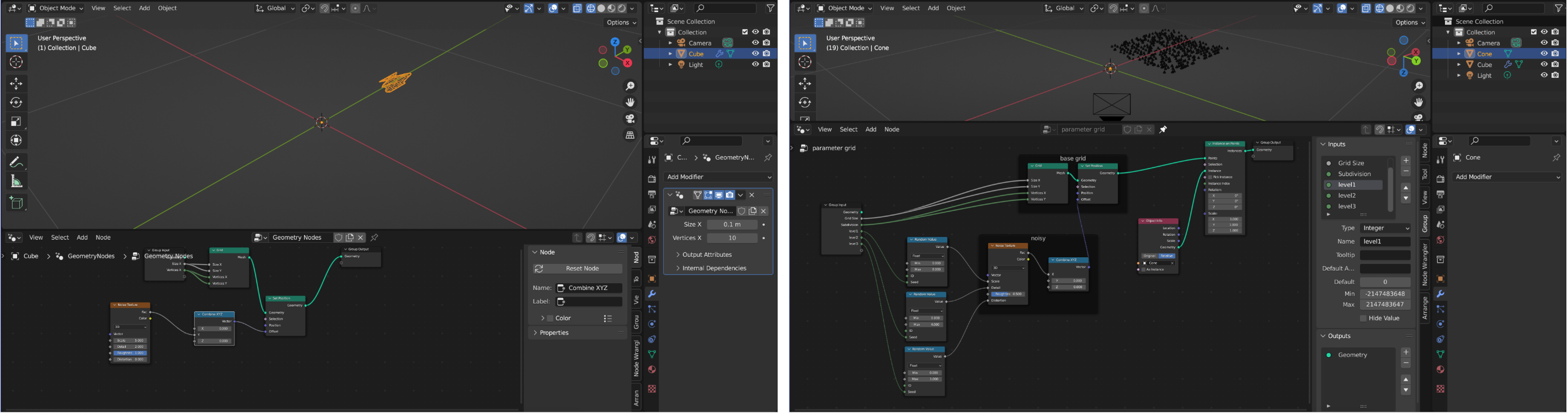 Parametric surface generation and textile-inspired structures developed through digital tools.