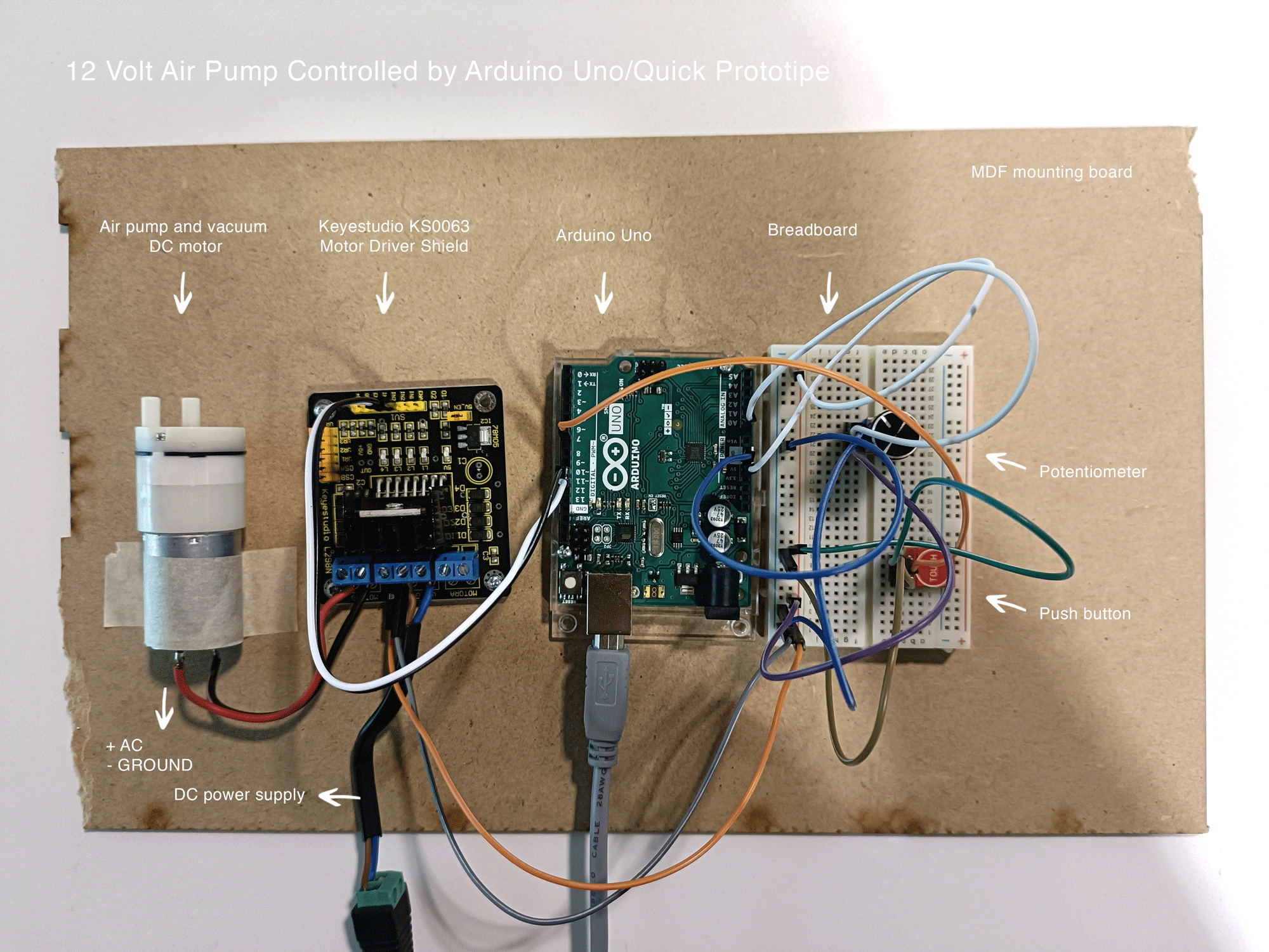 🔧 Main Components: Arduino Uno, breadboard, DC power supply, push button, potentiometer (trimmer), jumper wires, KS0063 shield, DC air pump/vacuum motor, power wires, wooden/cardboard mounting board, soldering iron & solder.