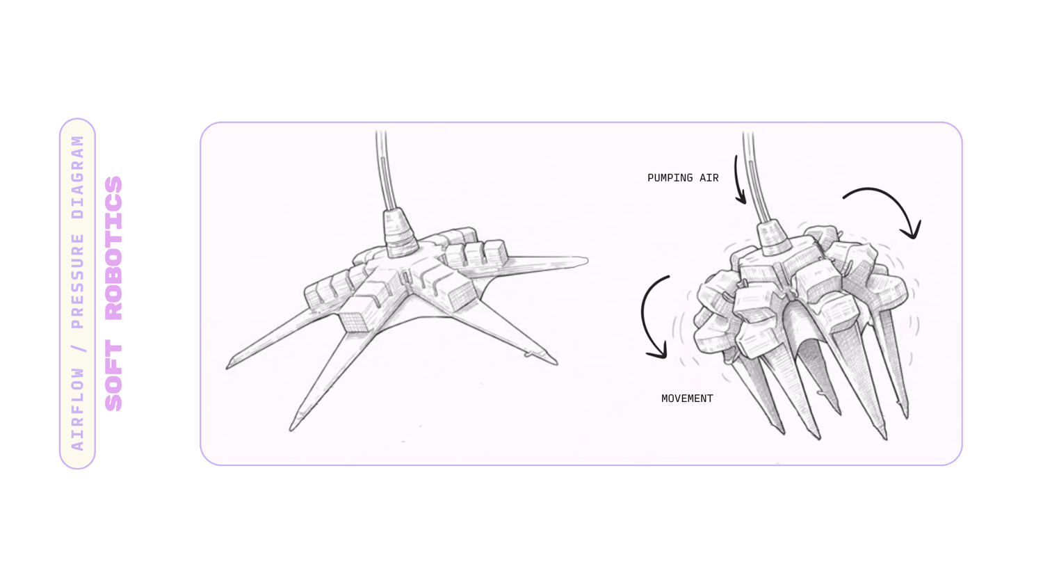 Soft robotics draws directly from the remarkable efficiency of living organisms, which achieve complex behaviors through softness, flexibility, and seamless interaction with their environments. Many species demonstrate how adaptable and energy-efficient movement can emerge without rigid mechanisms: jellyfish propel themselves through gentle pulsation; octopuses manipulate objects with continuous, fluid deformation; corals optimize structure and flow through porous, branching geometries; sea stars and worms rely on hydraulic pressure to extend and contract their limbs. These biological systems show how form, material, and function coevolve to create solutions that are lightweight, responsive, and sustainable. By observing how organisms sense, move, and adapt to external forces, soft robotics seeks to translate nature’s strategies into engineered systems capable of resilient motion, distributed actuation, and harmonious interaction with their surroundings. This research draws from these natural strategies to inform the development of soft, efficient, and environmentally responsive mechanisms.