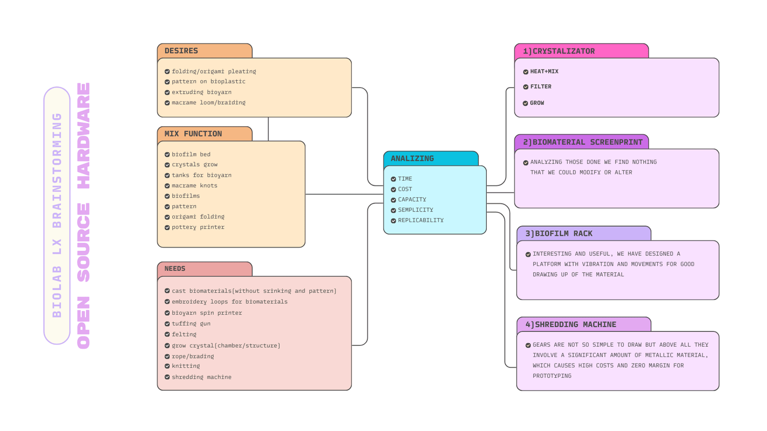 From this process, we narrowed down our options to four potential projects: Crystalizator, Shred Machine, Biomaterial Screenprint, and a Vibrating Plate for leveling biomaterials. We quickly discarded the projects that seemed deceptively simple but were in fact problematic. The Shred Machine, for example, posed risks of handling large amounts of metal and chemicals from commercial materials. I was particularly concerned about safety and environmental impact—microplastics and residual chemicals released in uncontrolled spaces made it unsuitable for open use.