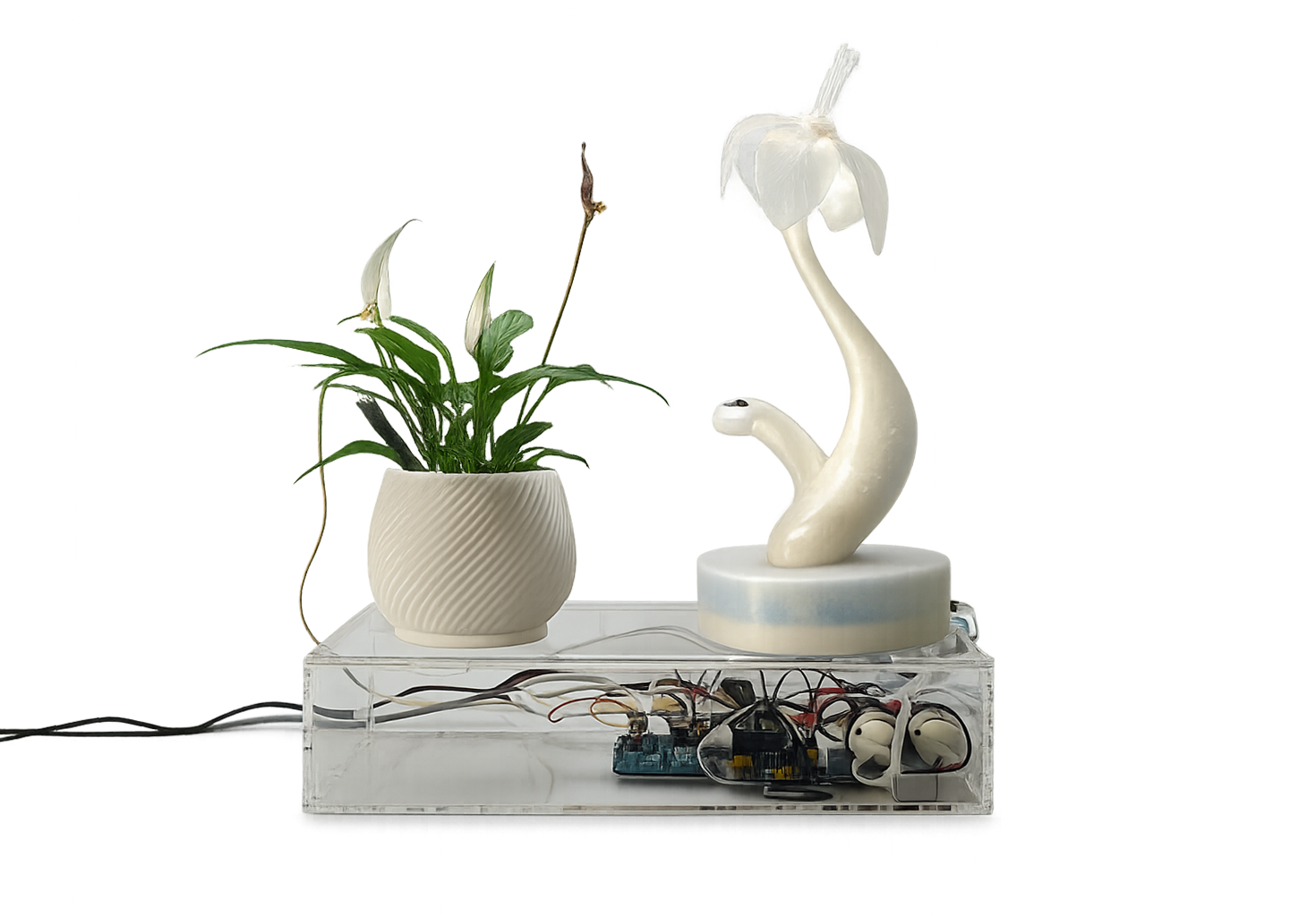 The living plant is conceived as an active biological component of the system rather than a decorative element. Its selection depends not only on bioelectrical responsiveness and maintenance, but also on its capacity to coexist spatially and conceptually with the artificial flower and the electronic infrastructure.