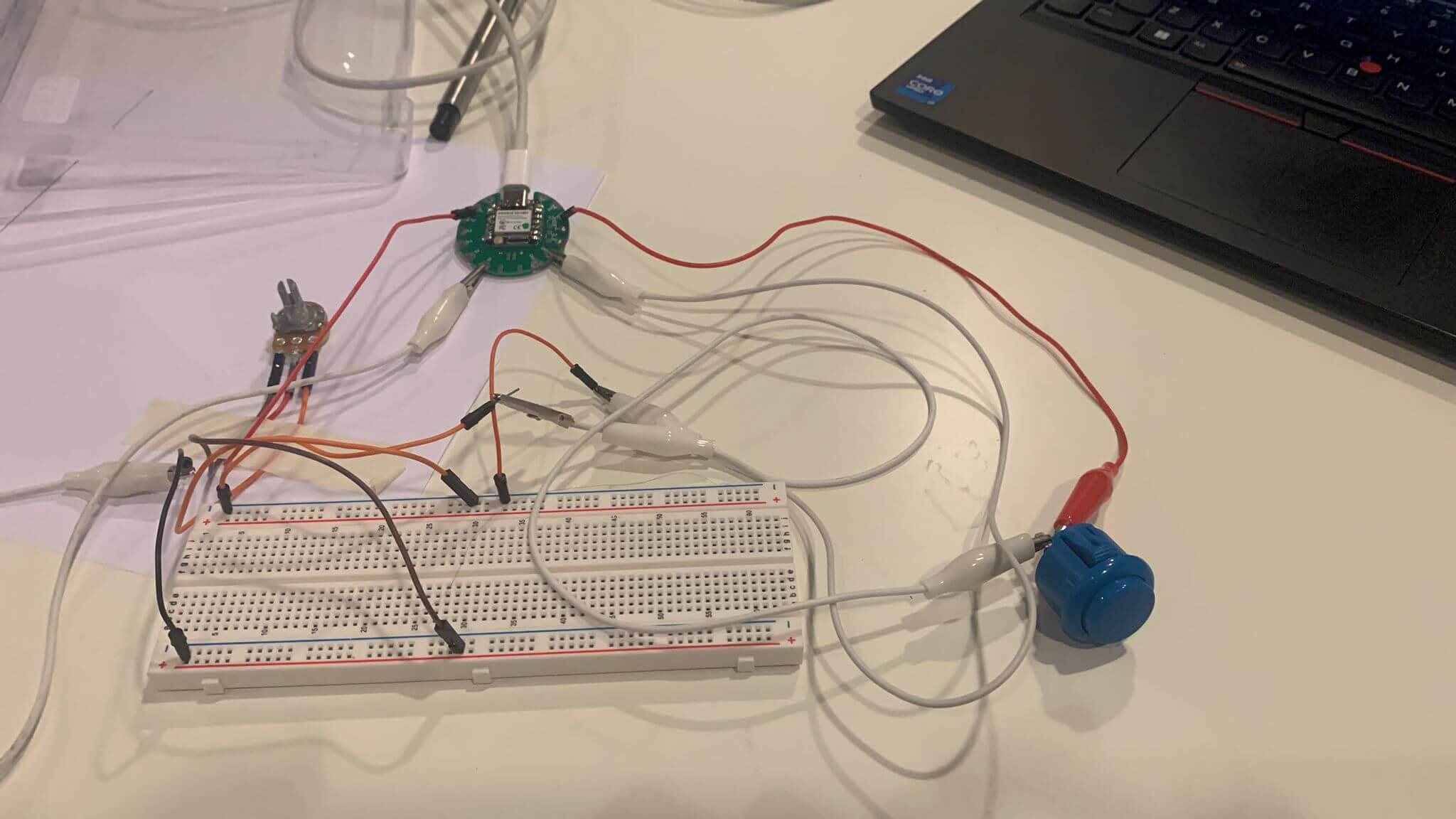 This is the result with a breadboard and jump wires. There is a potentiometer and a switch as an input. Garage Band linked by bluetooth on my phone is the output.