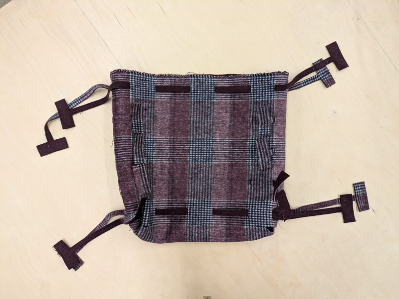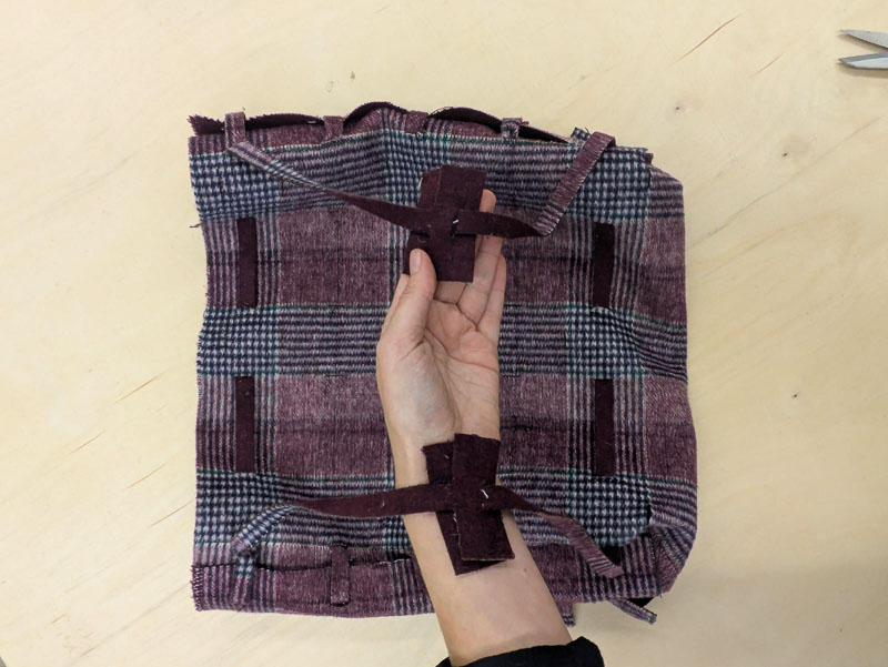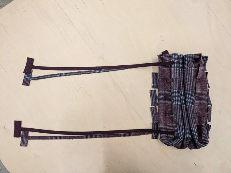 I also cut long strips with flaps on the end. These pieces act as sash so I can cinch the bag in different ways. The can also double as the handles.