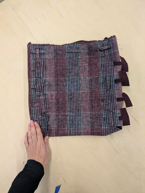 The material I landed on was 50 percent polyester and 50 percent wool. When I tried a match test it burned slightly but extinguished quickly and seemed to melt at the edge which was a good sign.