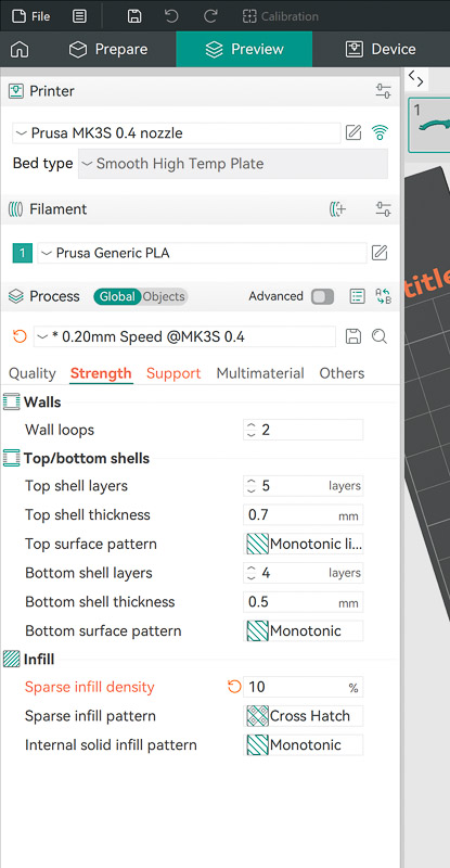 Next I went to the strength tab. The Infill was originally 15. Because this was a proto type I changed this to 10 so it would print quicker.