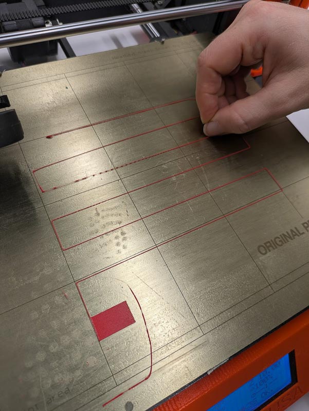 As the test went along the lines closer to the front got flatter and more consistent because we manually pushed the printer head closer to the bed by turning the knob.