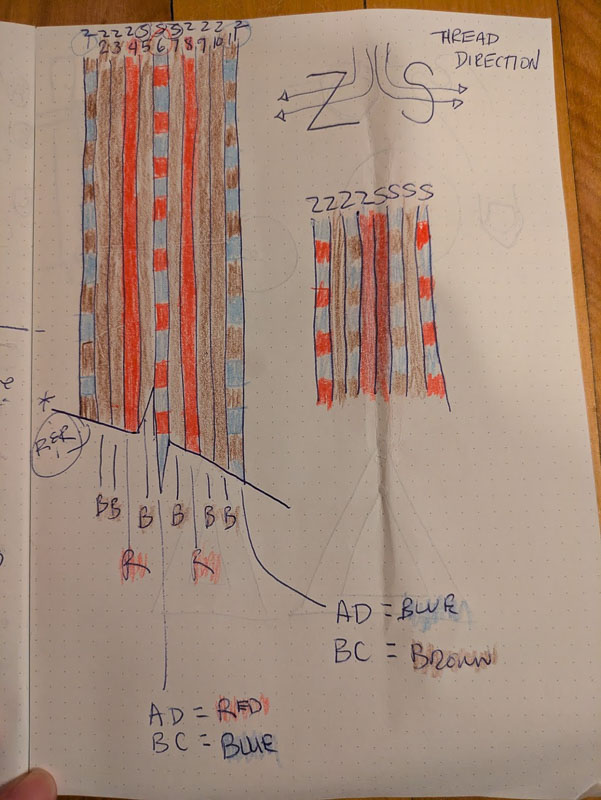 After threading for a long time I realized I needed to simplify for my first test. So instead of using all 11 cards, I used six and moved to the second drawing on the right, (minus the red stripes in the middle)