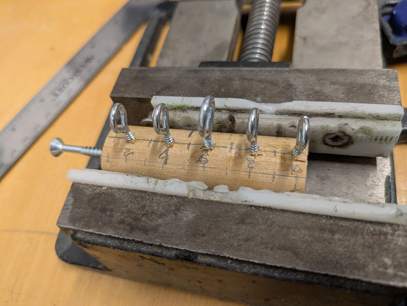 So instead I cut this dowel with the chop saw and I measured the exact placement of where the screw eyes should sit, alternating them on top and bottom.