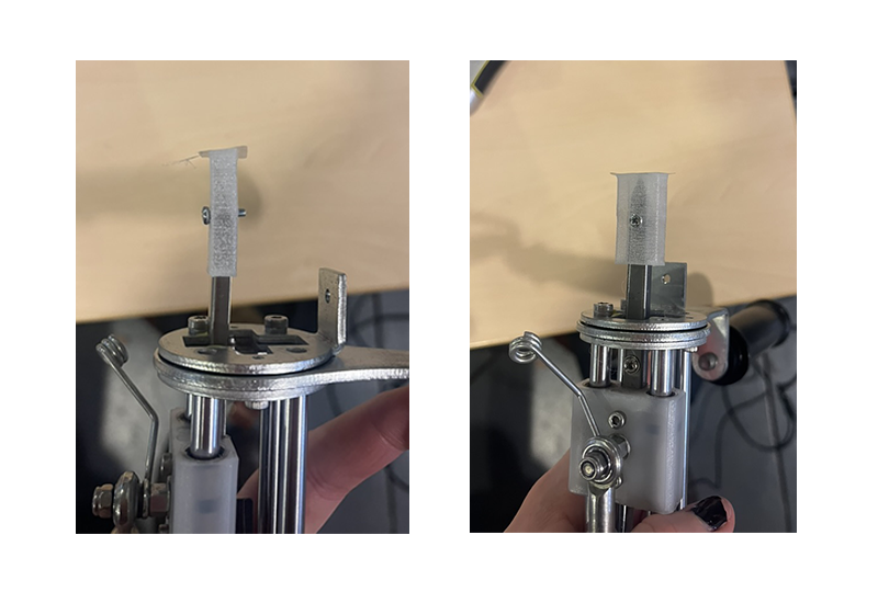 First, I modeled a rectangular counter‑shape that fits snugly around the gun’s tip. I chose to print it in FLEX so it would grip better and be soft enough to absorb the movement’s impacts. This part has two holes passing through the needle’s eyelet so a screw can be inserted to secure it.