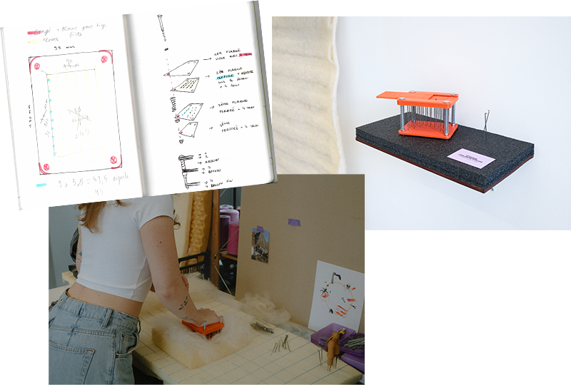 Thinking about my tools as part of my creative process is an essential aspect of my approach as a designer. I am equally interested in industrial and artisanal machines ; by understanding them, I can hybridise them and create new ones according to my needs and the needs of the material. Building on Alexander Marinus’s research on flax felting, I later developed a new machine that allows me to felt larger surfaces with different needle-density settings.