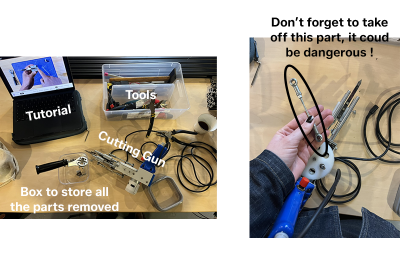 We each have a Cutting Gun, and the particular feature of this model is that it has a pair of small scissors built into it. With every back-and-forth movement of the needle, the scissors follow to cut the yarn pushed through the fabric to create fringes. The first step, therefore, is to remove these scissors since we don’t need them, they can even become dangerous.