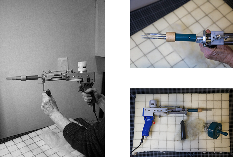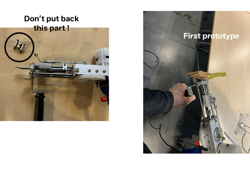 A few months ago, I bought a tufting gun with the intention of hacking it and turning it into a felting gun, in order to make certain steps of manual felting easier thanks to its motor and adjustable speed. This week was the perfect opportunity to finally work on this project, and fortunately Carmen and Annabelle agreed to collaborate on developing this new felting gun.