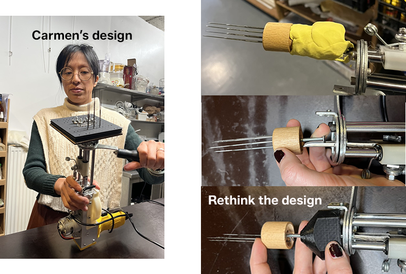 Carmen and I made a first mock-up using cardboard, modeling clay, and felting needles to understand how we could design the attachment that will hold the felting needles. We immediately noticed that we would need to place something inside the eye of the needle to secure the structure so it wouldn’t be ejected by the repeated movements. Meanwhile, Annabelle started designing a more technical piece so it could fit on different tufting guns, since we realized that our three guns had needle dimensions that differed by a few millimeters.