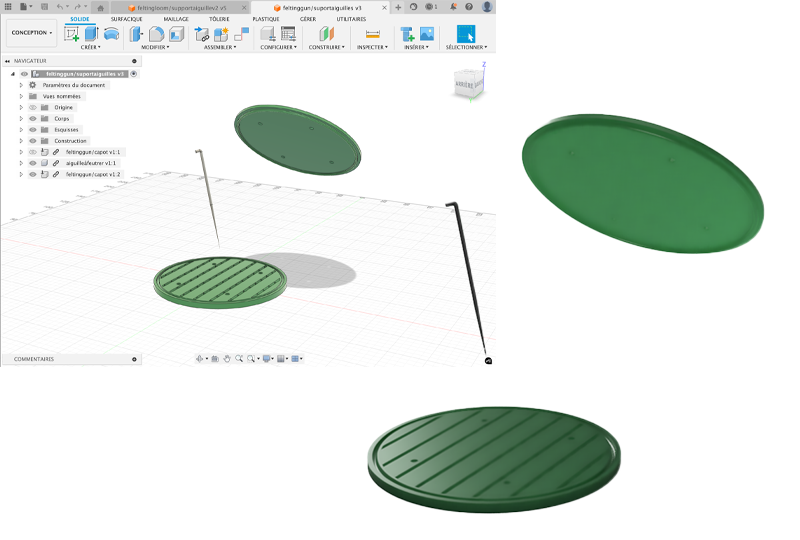 As mentioned earlier, we noticed that the initial part we designed wasn’t suitable because it moved too much. So I started thinking about a new, simpler design by visualizing it with modeling clay and pieces from other existing tools. The idea was to keep the tip of the traditional felting tool and slide it onto the hook of the tufting gun needle.