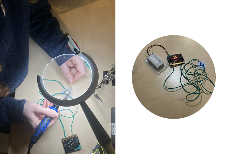 While the prints were in progress, I began connecting the components using a flexible wire covered with a green sheath, matching the Micro:bit and reminiscent of headphone cables. Once the connections were made, I stripped the insulation at each end, twisted the metal strands together, and then secured everything by soldering with tin.