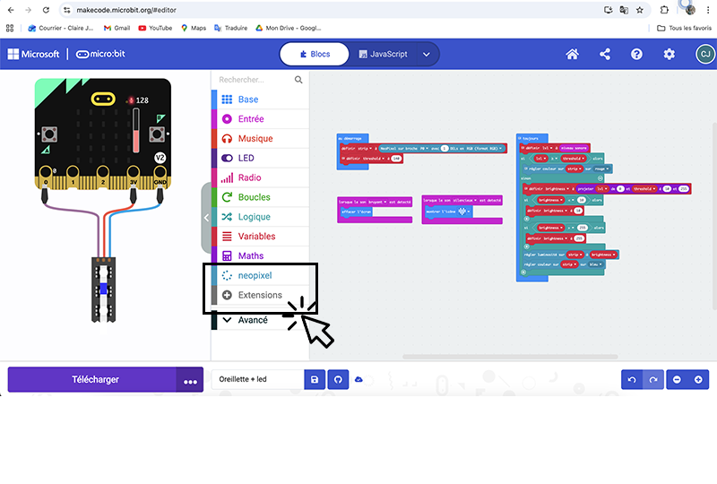 The idea was to display a heart on the Micro:bit when the sound level is not too high, and to make the heart disappear when the sound becomes too loud. Then I added a Neopixel. To do this, you need to install the Neopixel extension in the Micro:bit MakeCode interface.