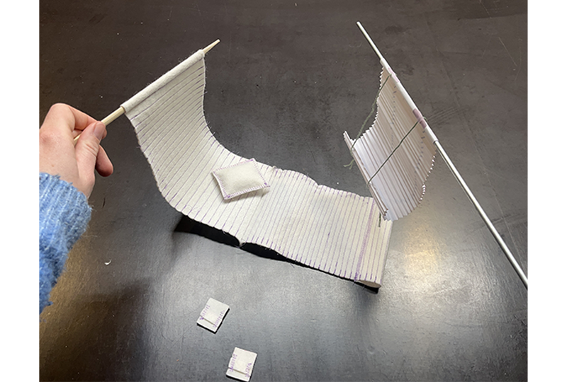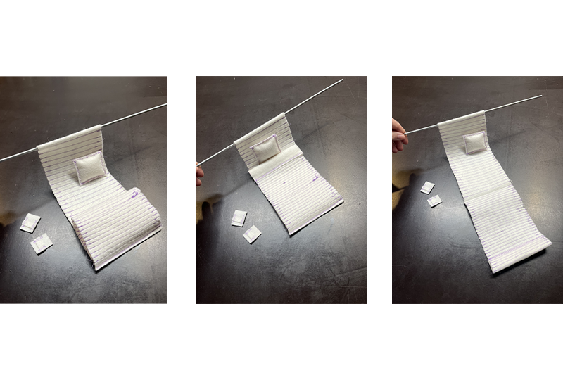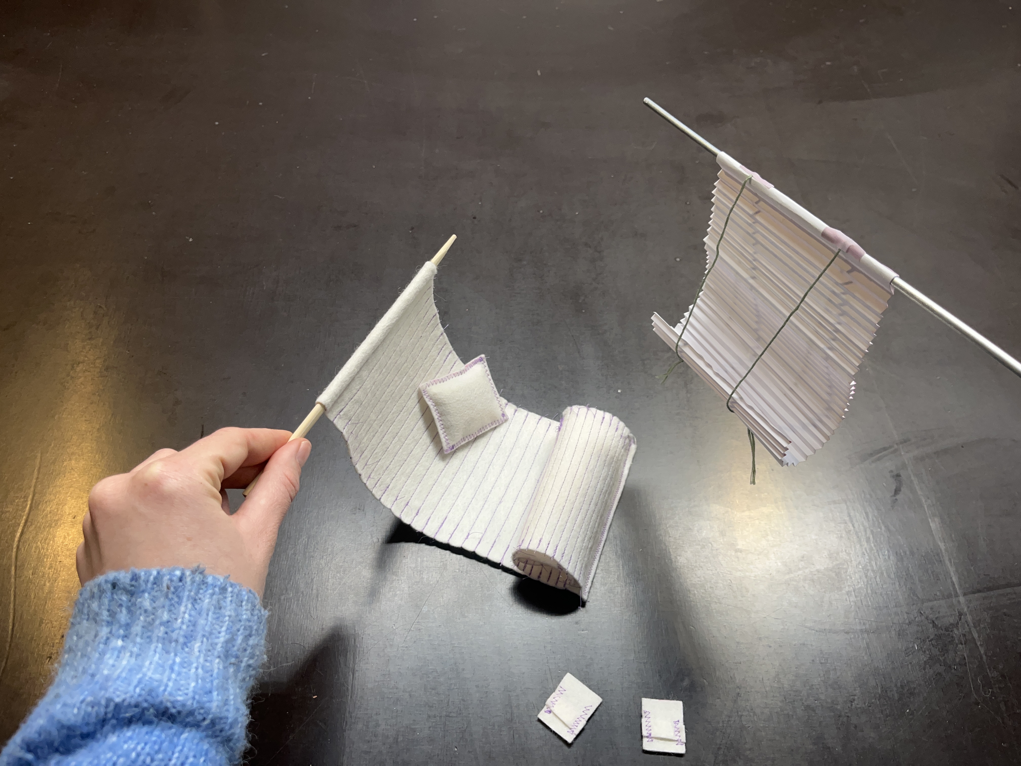 Facing north-east, the tapestry/bed emphasizes notions of rest, isolation, and protection. Here, wool acts as a thermal and sensory envelope, creating a space dedicated to calmness and retreat. Facing south-west, the modular blind filters light and heat while generating a soft, vibrant atmosphere through the natural properties of wool. These two elements evolve throughout the day and adapt to the needs of the body and daily uses. Together, they form a dynamic textile habitat that revalues a forgotten material and reveals its architectural and domestic potential.