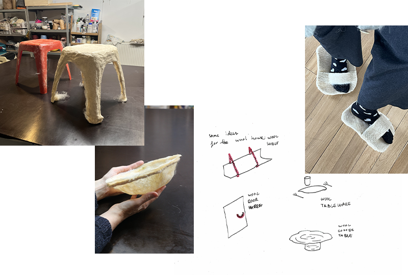 Additional elements may be added, everyday objects such as glasses, stools, or wool slippers, in order to build a more narrative vision of the project and to suggest lived-in, domestic gestures within The Wool House.
