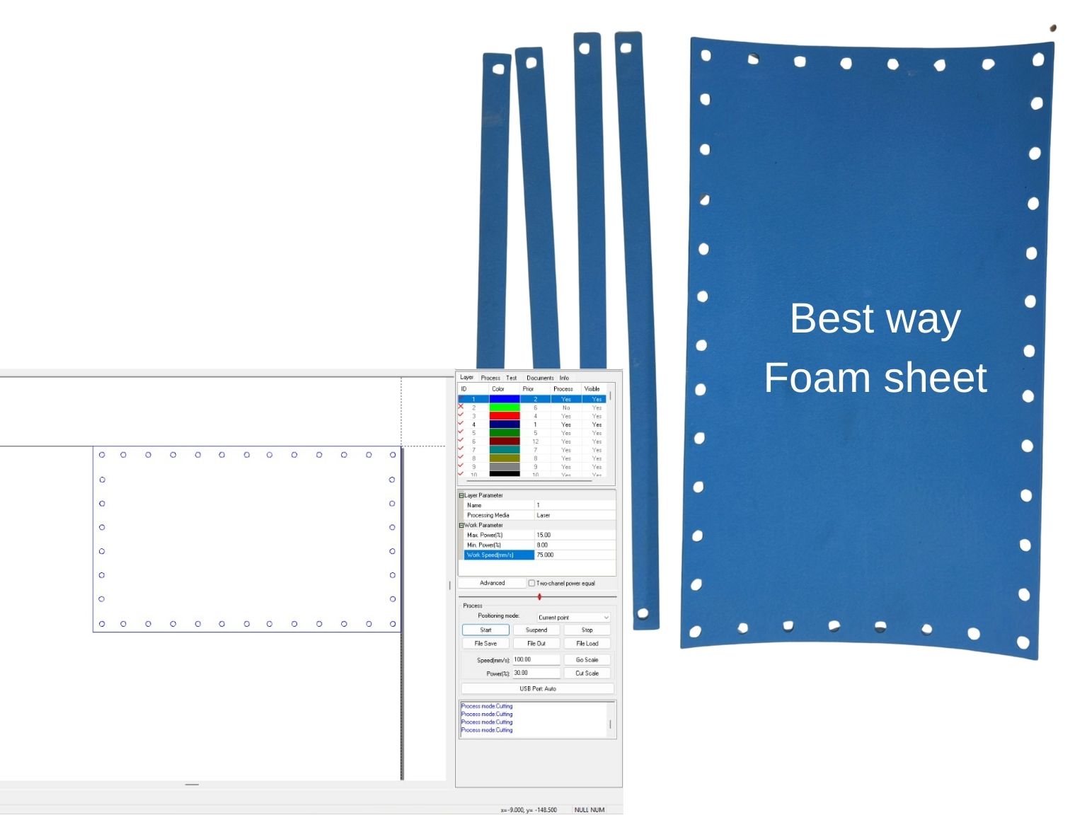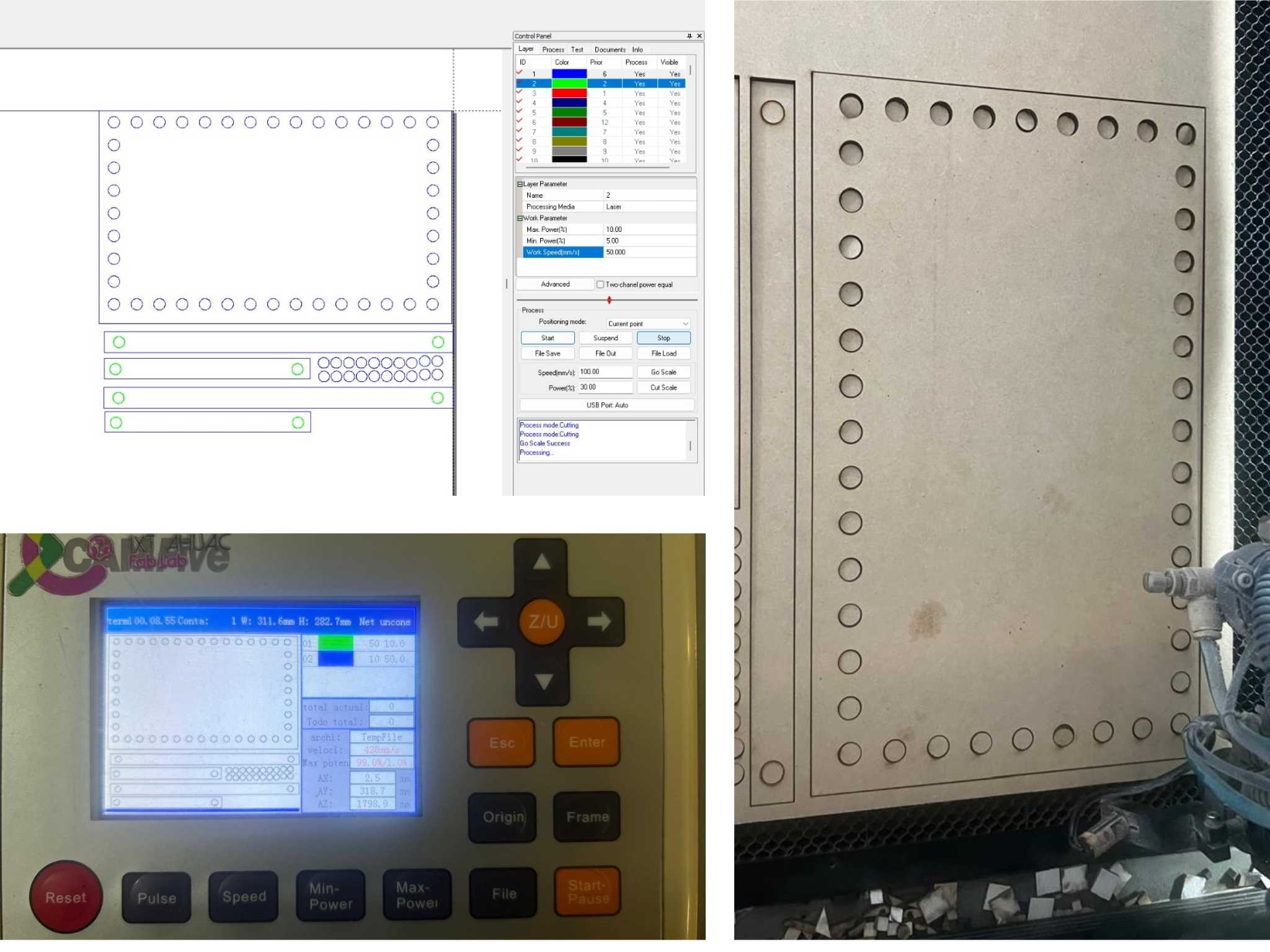 To find the best way to have a bed that was stable enough but smooth enough to mark the passage of the punch through the material, Dani and Sam did a first test by cutting a first bed with the help of the laser cutter. However, it did not turn out as planned, so they resorted to other options.