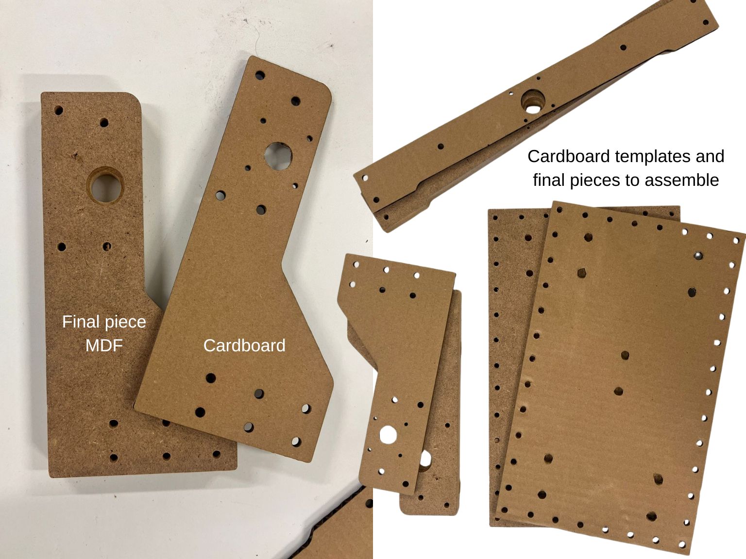 The first idea of the bed and frame was designed in mdf of 3mm, the idea was that the frame would be assembled simply by fitting the circles into the holes, thus avoiding the need to replace the entire printing bed; it would be more of an addition. However, these circles didn't provide enough clamping pressure to prevent the paper from shifting. Therefore, a completely new printing bed was created using thicker MDF, and the holes were now designed for screws and nuts. The metal bed was removed and replaced with the new wooden one, which had a foam coating to provide a smooth surface for the stylus, allowing for better tracing.