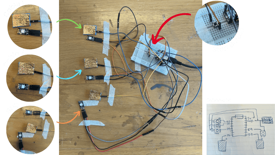 To have a clear idea the basics of the electronic required for this project, I began to make a few test using first only two sensors, then adding one more no see how easily or hard it was to add another pin of interaction.