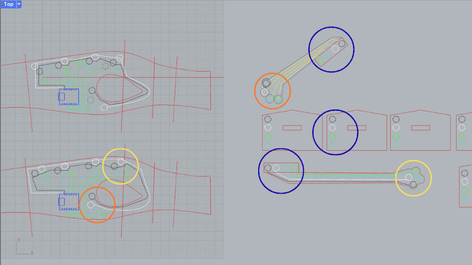 At first, I just traced all the metallic pins I would use and started to figure out the paths of all the connections, having in mind that 5v and GND would have to go through all the hand harness. The safety pins have a diameter of 7mm, so I also trace them to have a more accurate dimension idea. To make them easier for the person that use it, I re-arrange the distribution of the safety pins, so that it would be the same on any finger (except the thumb), and so whichever piece they connect would work.