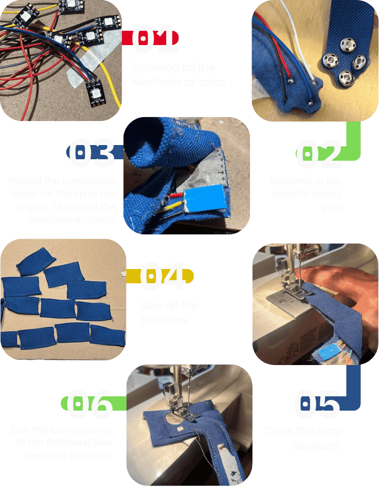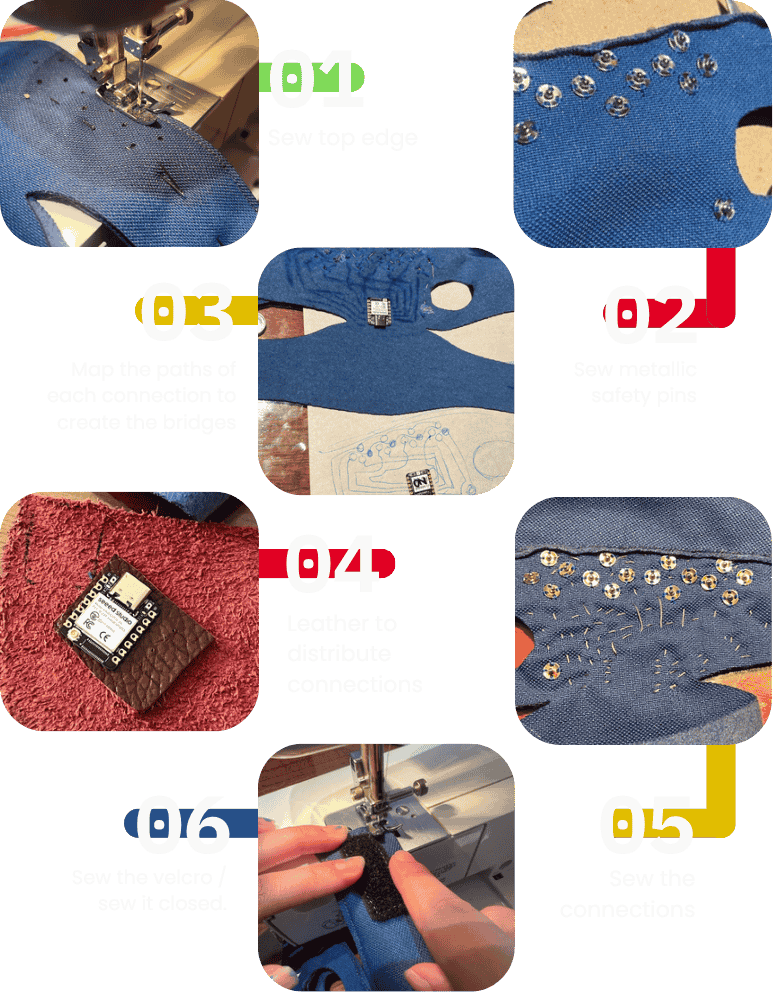 After many ideas, sketches, prototypes, I came to the final design this gloves modular with and “skeleton approach”, using metallic safety pins to make the electronic connections.