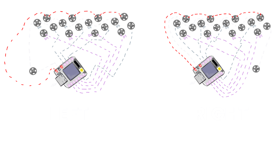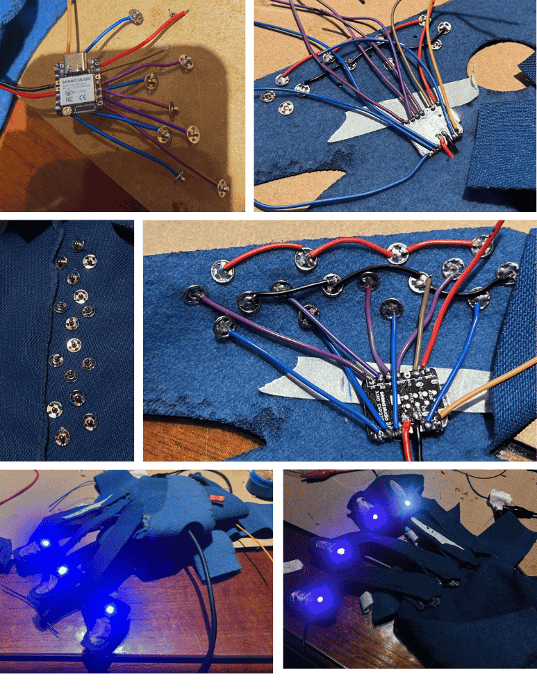 For this second try, I used only conductive thread, first maping the paths of each connection, because I could only connect the neo pixels to D1,D2,D3,D4, meaning having to cross paths with the connections of the “sensors” D10,D9,D8,D5.