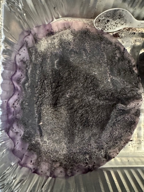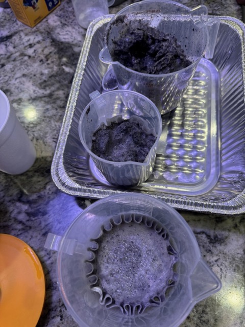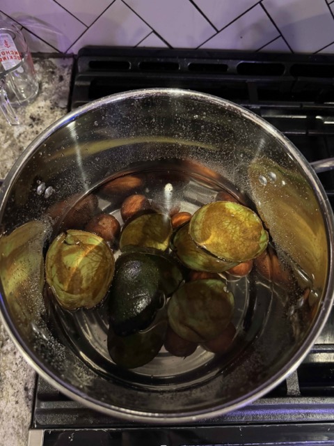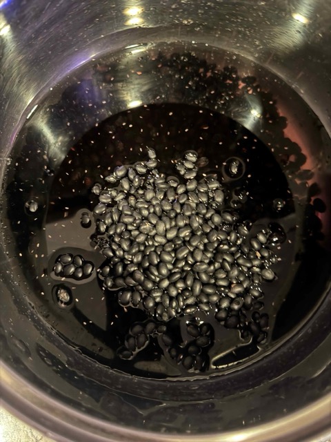The blackbeans were placed in water and sat for a few hours. Next, I put the beans in a pot and simmer for 2 hours. It had a dark blueish black hue. I strained the blackbeans out and added the fabrics. I let it sit overnight in the dye bath.