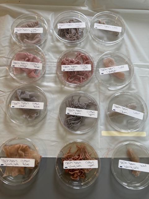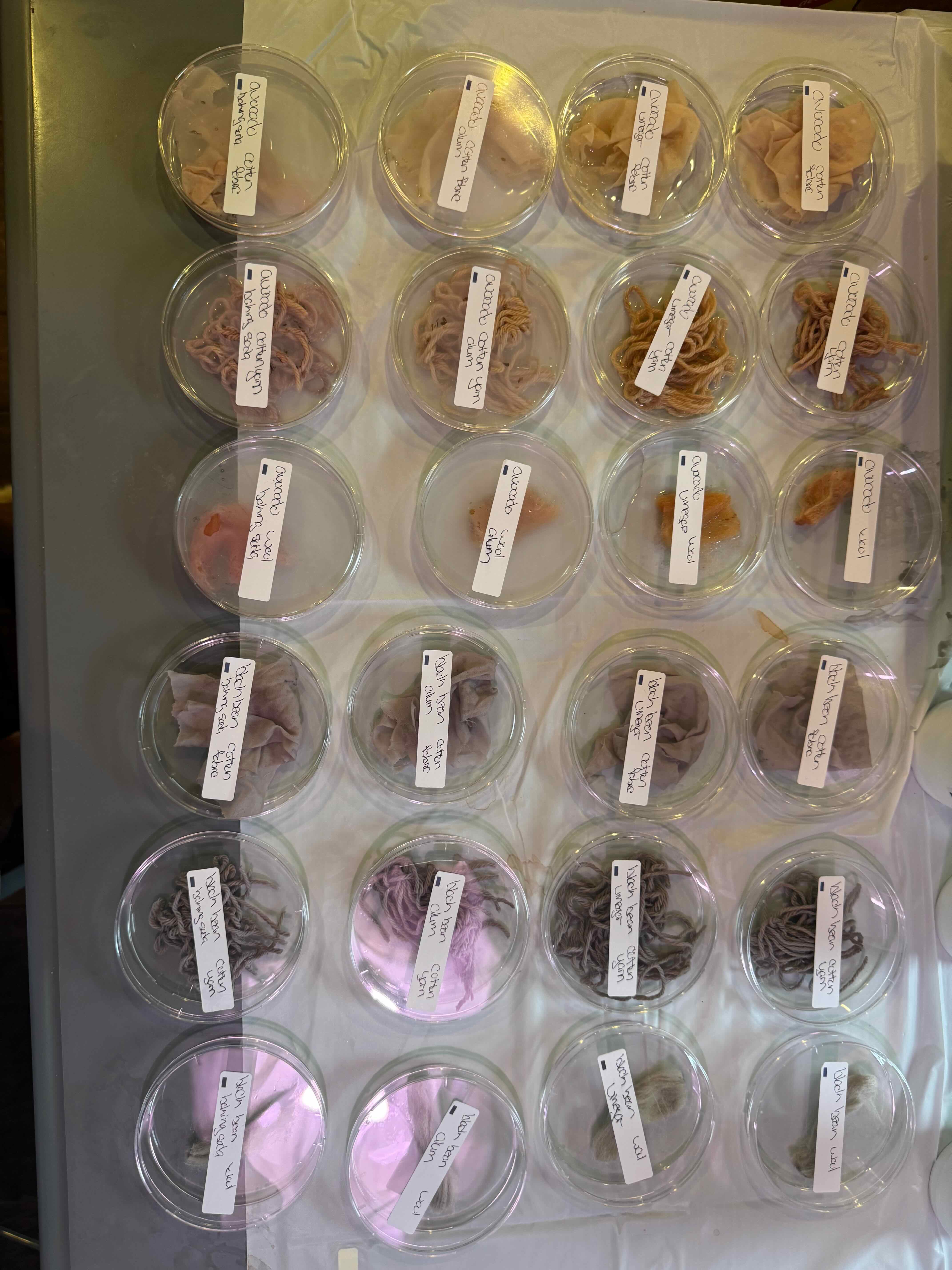 On the right, an image of the blackbeans, with different types of modifiers. The same mordants were used as he avocardo (i.e., vinegar, alum, and sodium bicarbonate). The three types of fabrics were used as well.