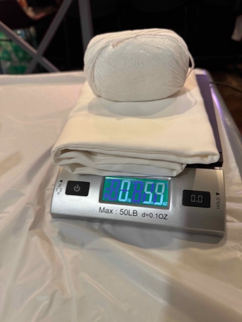WOF From the image above, the weight of all of the fabric was was 5.9 ounces which is converted to 167 grams.