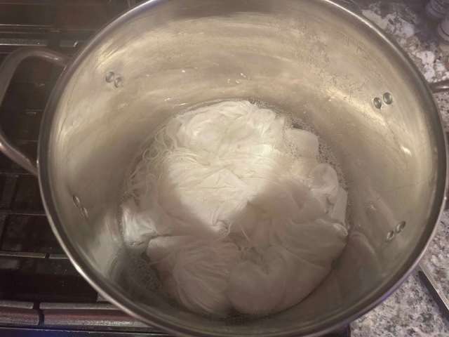 Both the avocado skins and pits were throughly cleaned and place in the pot with water. The dye bath simmer for over 2 hours and the color looked a little light. I simmer it again for another hour and strained the skins and pit out of the pot. I added all of the fabrics and left it overnight.