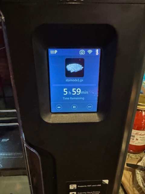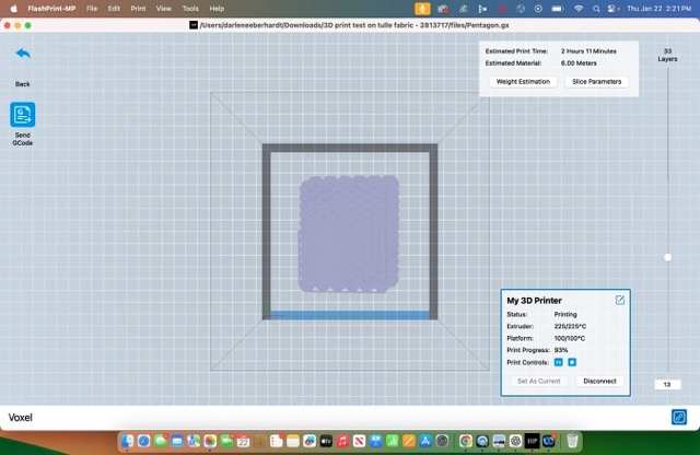 The print was sliced in 33 layers. After the first 3 layers were completed, I add a tulle fabric to the print. The print continued and my final model for printing below.