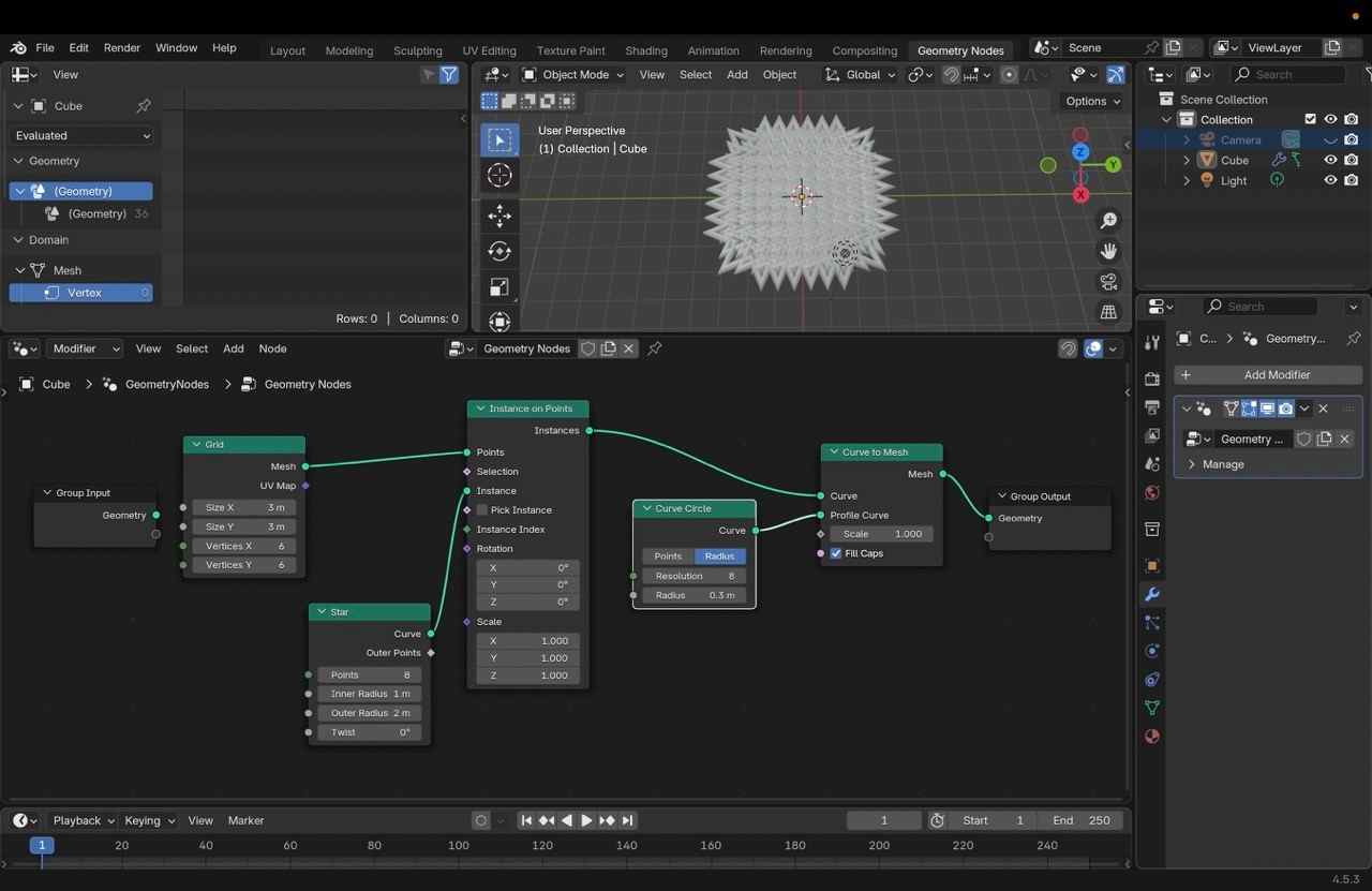 This Geometry Nodes system generates a procedural radial surface by instancing a star-shaped curve across a grid and converting it into a mesh. A Grid node establishes the base point distribution, functioning as a structured scaffold that controls where geometry will be placed. A Star curve is then instanced onto each grid point using Instance on Points, creating a repeating geometric pattern. To transform the curve instances into solid geometry, a Curve Circle is used as a profile and fed into a Curve to Mesh node. This extrudes the instanced star curves into volumetric forms, producing a dense, spiked radial structure. The final output is a parametric object whose complexity and density are controlled by grid resolution, star parameters, and curve profile size.