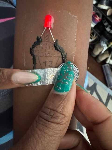 The images show a prototype skin electronic tattoo translating the cupcake sketch into a working soft circuit. A hand-drawn tattoo design was applied directly to the skin as a visual base, and a small LED was positioned at the top of the cupcake candle to act as the output element. The LED is powered by a coin-cell battery using conductive tape to complete the circuit. When the circuit is closed, the LED lights up, transforming the drawing into an interactive wearable piece. This experiment demonstrates how simple electronic components can be integrated with body-based design, merging illustration, symbolism, and circuitry. The result functions as a temporary epidermal interface that combines personal narrative with responsive technology.