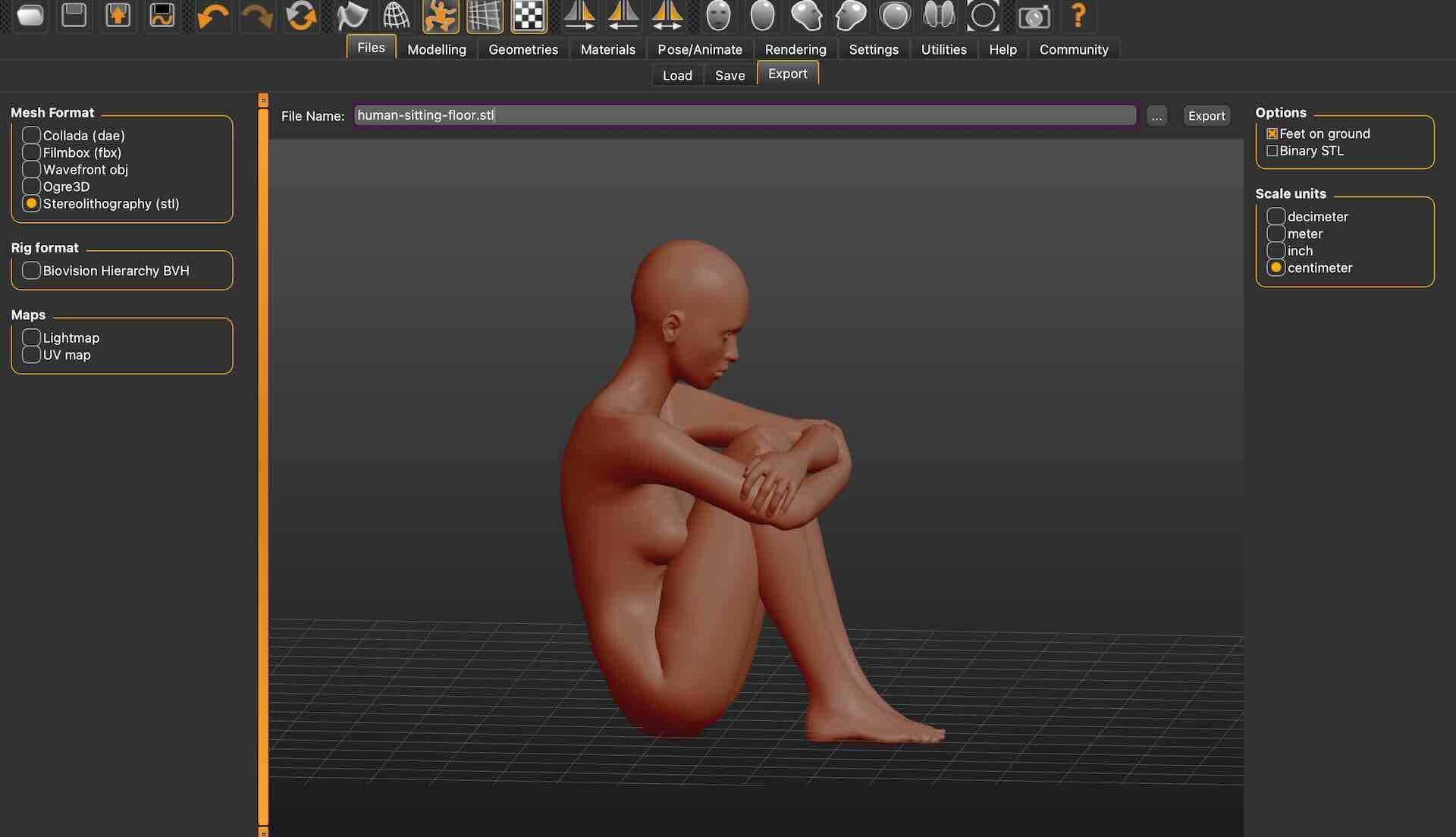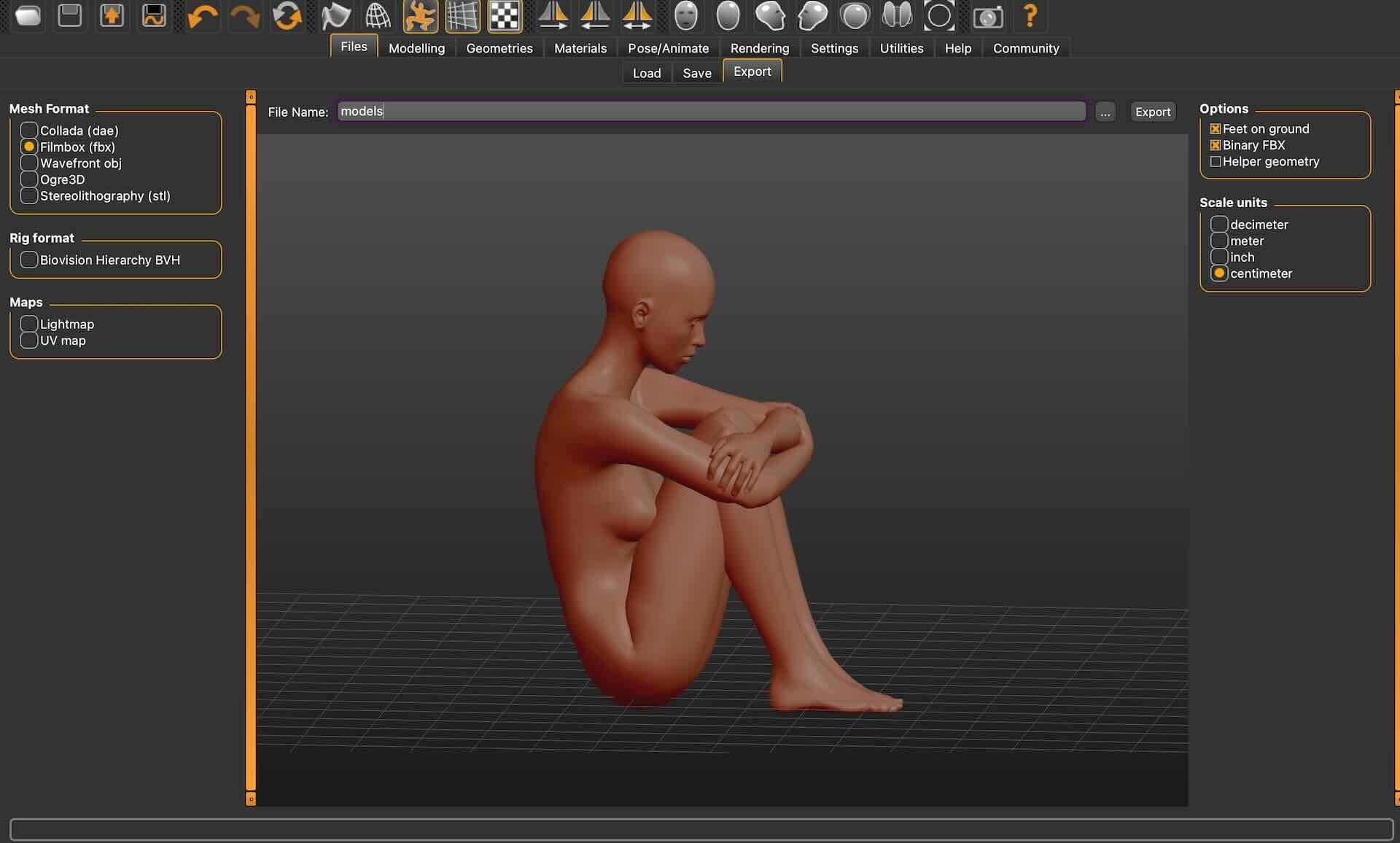 I exported from MakeHuman as fbx making sure I added the skelleton as Game Engine in settings. In Blender I tried changing the pose by moving the skelleton, and it didn't work completely. I think I was close to figure it out but I decided to go with the existing pose from the community to have enough time to go through the next part of the process