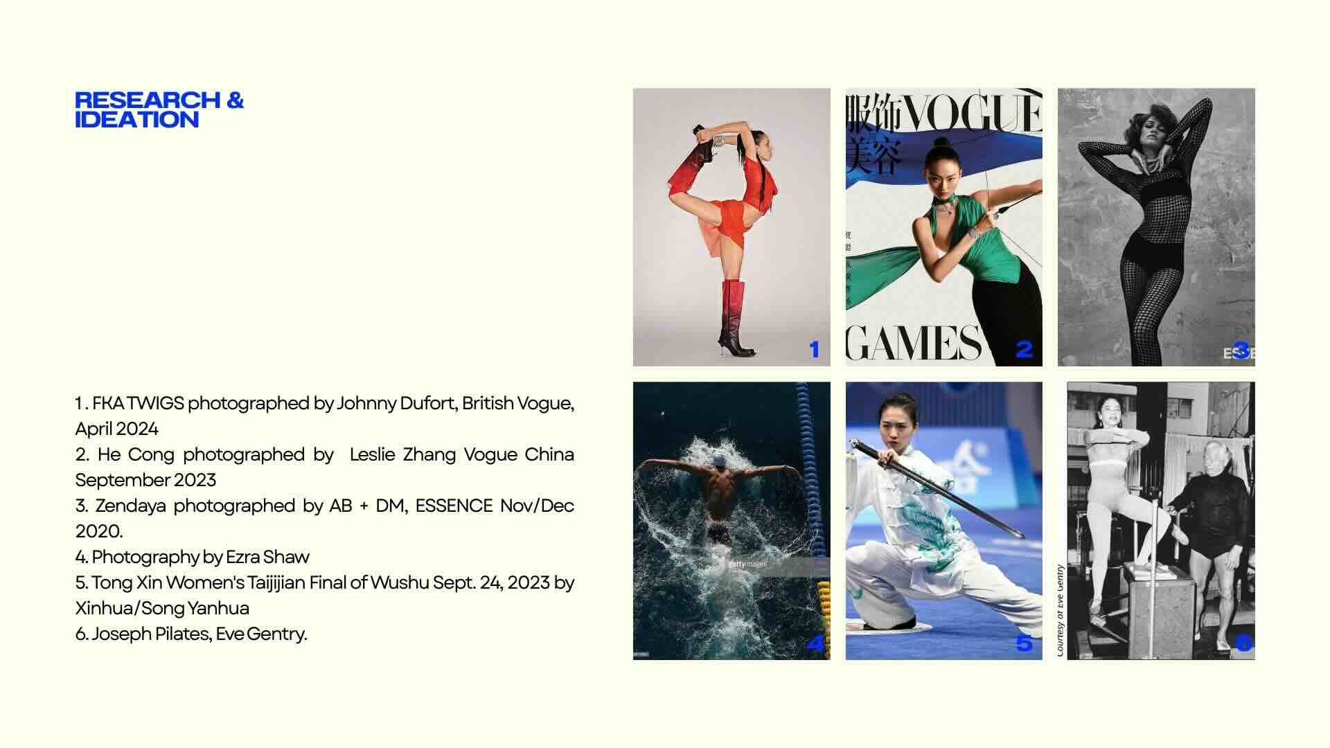 After the class and tutorials of these week, I spent some time researching for inspiration on things I like such as control, movement, music and artistic expression and how fashion has always been interested in capturing the body in these disciplines as we can see in some of the editorials.