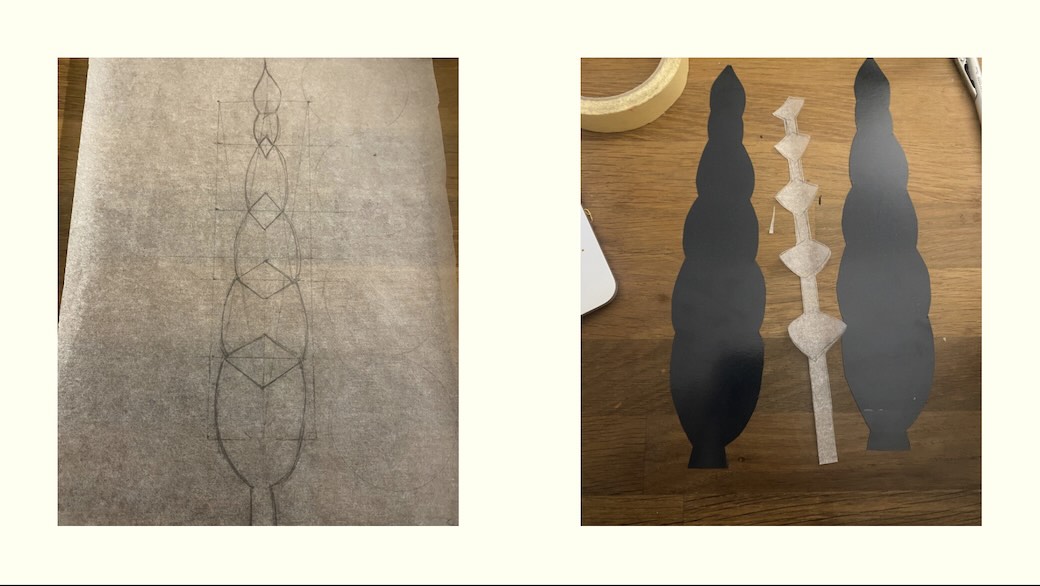 - I added the rhomboid shapes at the en of each section of the tail and cut them in baking paper.
