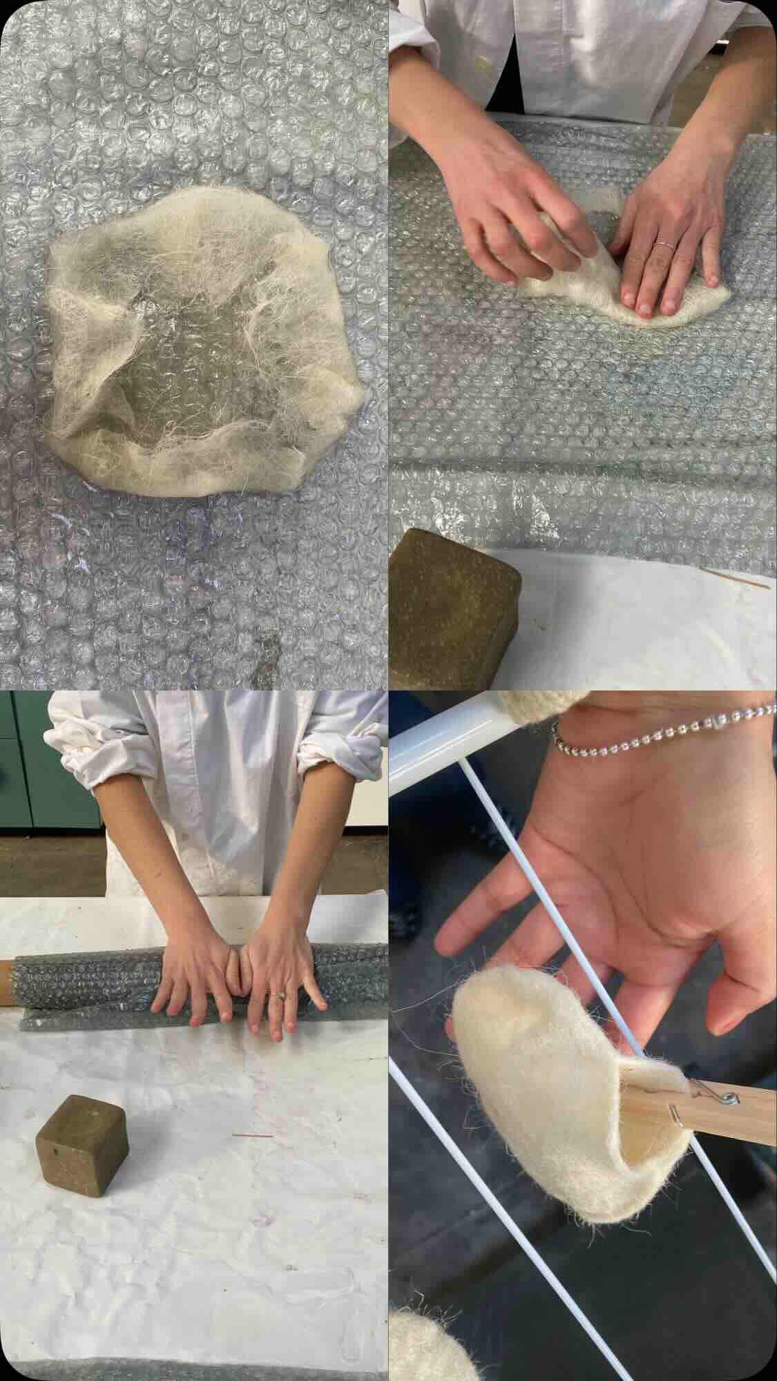 With the help of Capucine, I learned how to felt wool in a specific shape. We tried to make a wool "cover" for the silicone mold. I did not get to try it because the silicone ruptured. I managed to record a small video (above) where the 2 pieces of silicone were already letting air out.