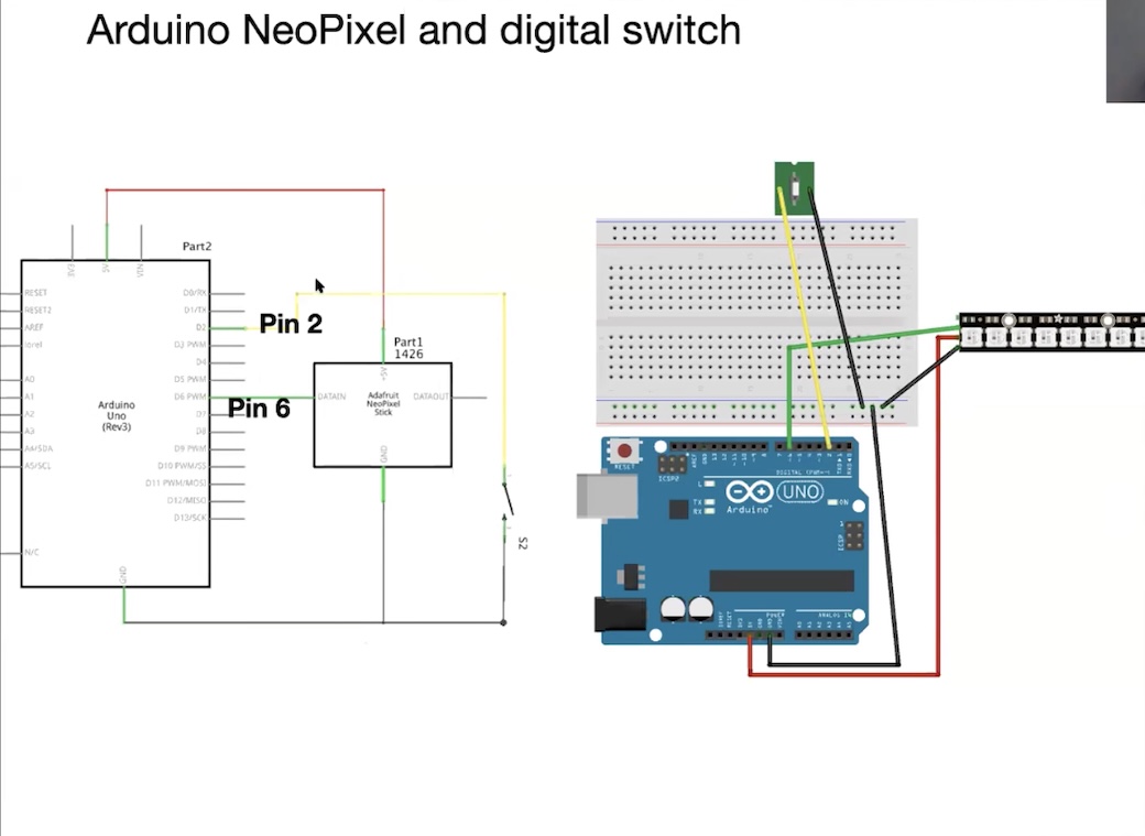 - Connect a jumper wire to pin ~6 according to the script. Then, an alligator cable to the D-IN connector in the neopixel.