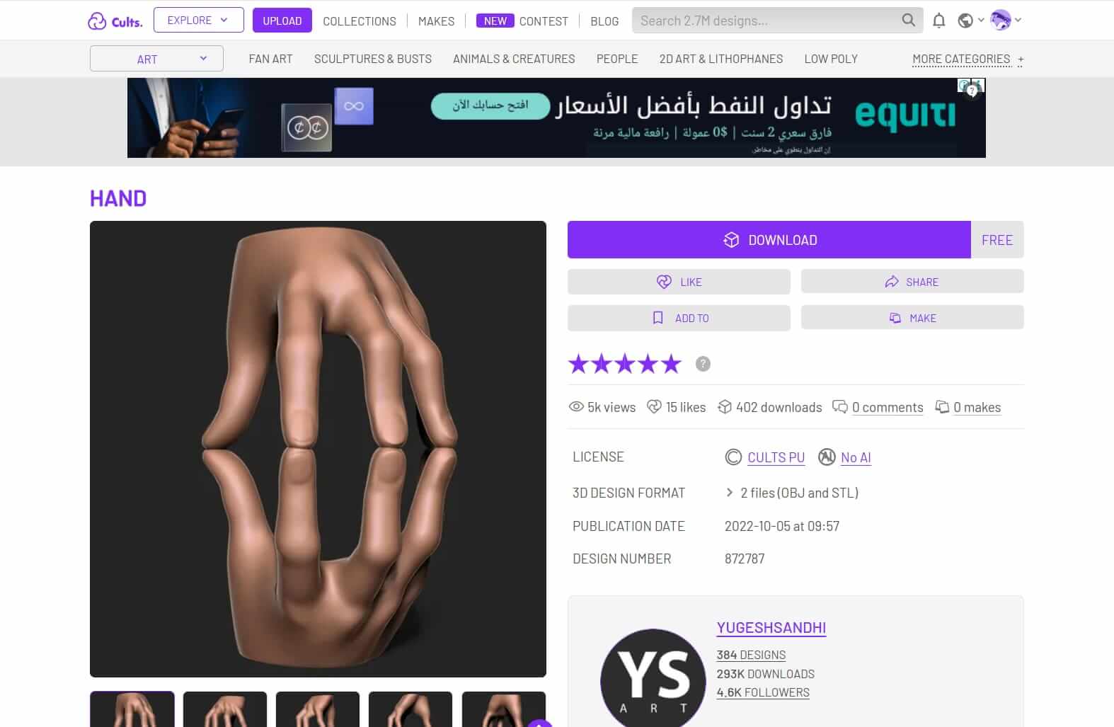 Since I aim to make a design of hands, I searched for the most suitable hand shape from the existing objects, then I exported it in STL format.