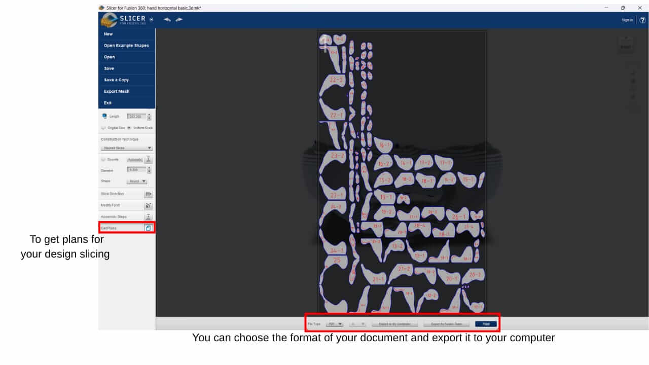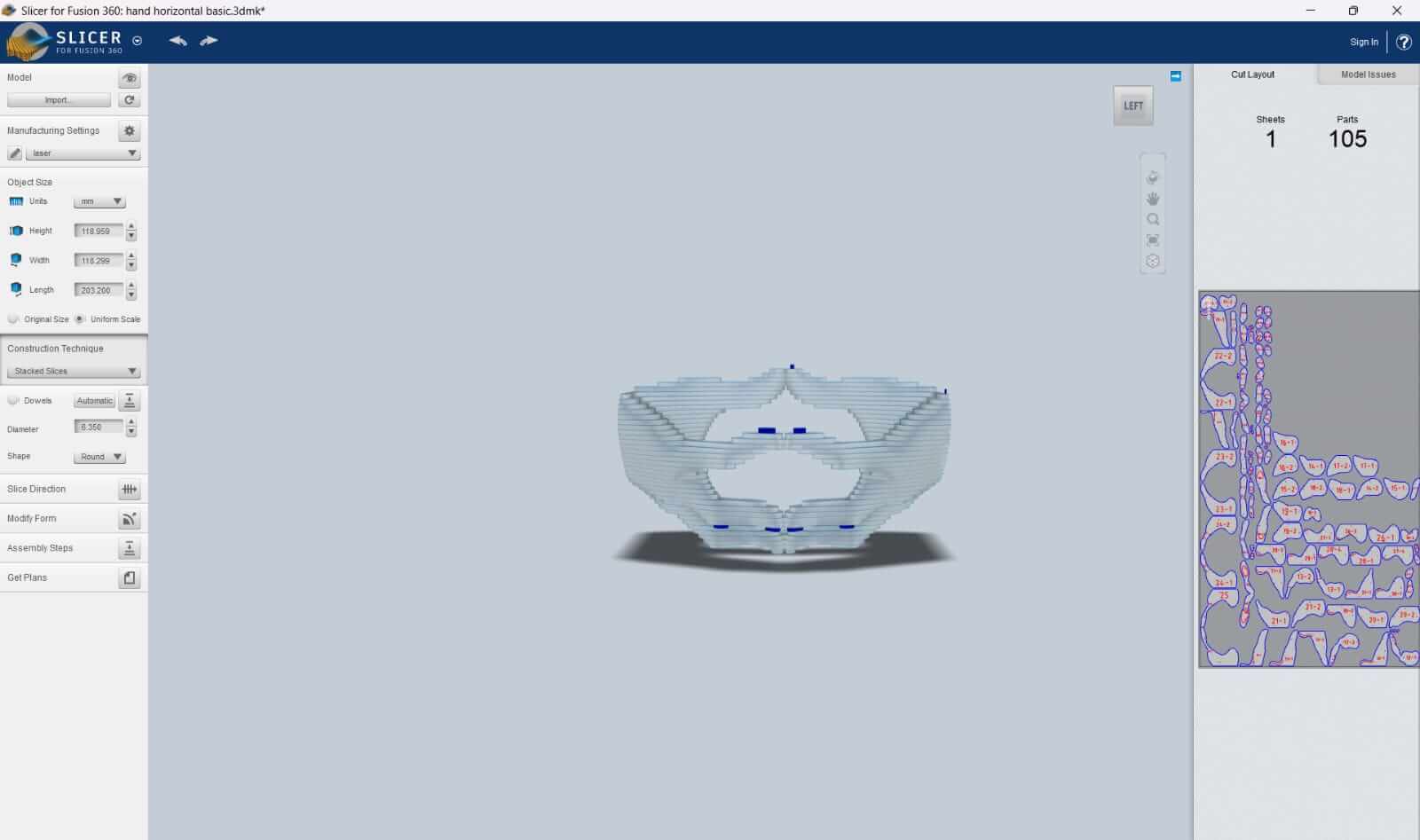 After downloading it in .stl format, I imported it into Fusion Slicer to prepare the file for laser cutting. This program allows you to convert 3D files into 2D cutting patterns. This program converts 3d models into slices whose properties can be controlled, making them ready for cutting using materials such as wood and cardboard.