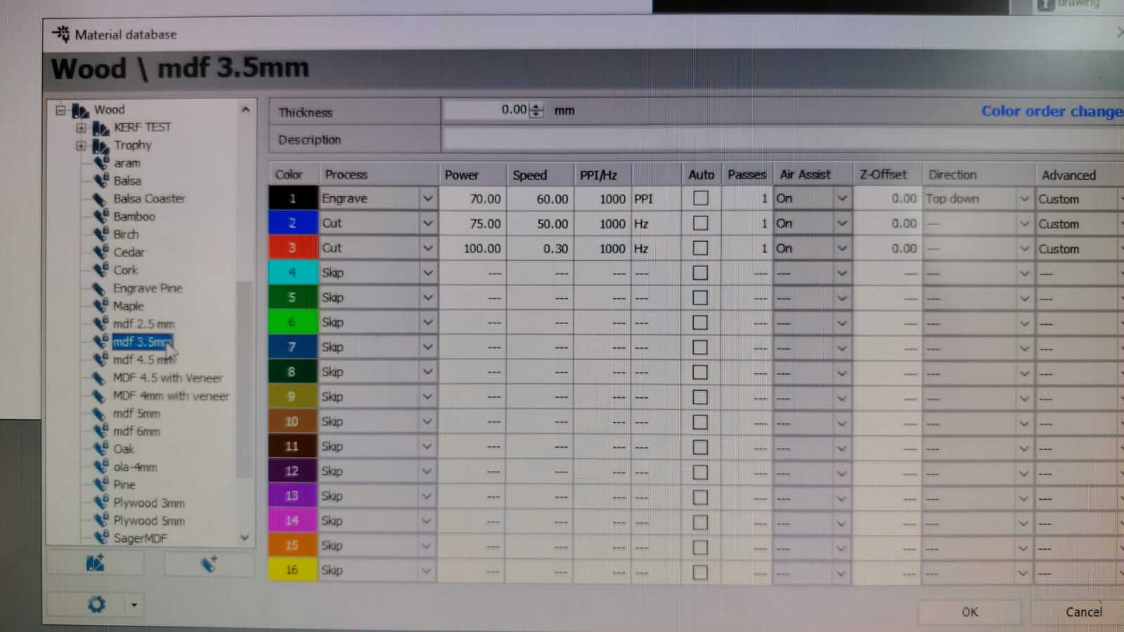 The image below shows the cutting machine settings, including power, speed, and frequency, for cutting 3mm thick MDF wood.