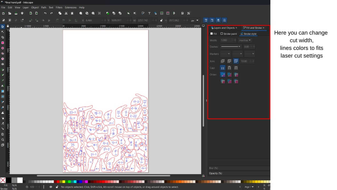 After preparing the file on Fusion Slicer, I imported it into Inkscape to make the necessary adjustments before cutting. The most important things I did were: