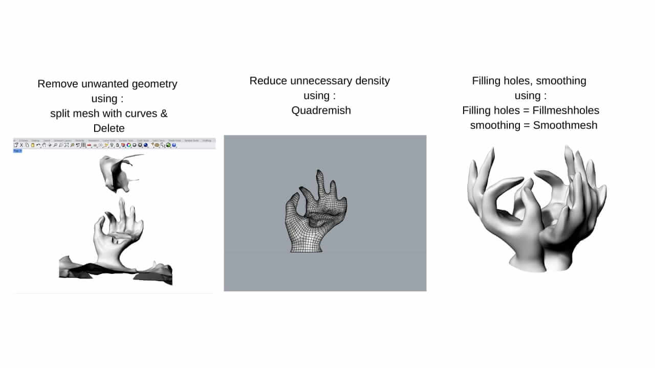 - I opened the file on Rhino and shown in the image below, after removing the excess faces, bridging the gaps, remeshing the mesh, and removing the noise, I started experimenting with a new design using the model I obtained from the 3D scan.